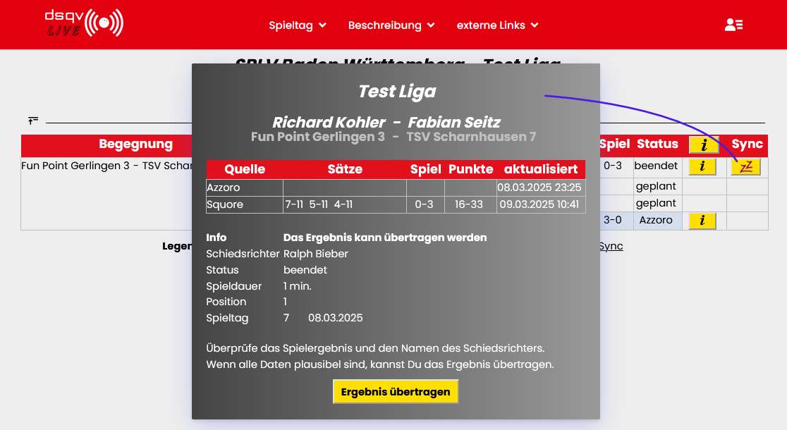 - Nach dem Spiel wird das Ergebniss vom Schiedsrichter hochgeladen.